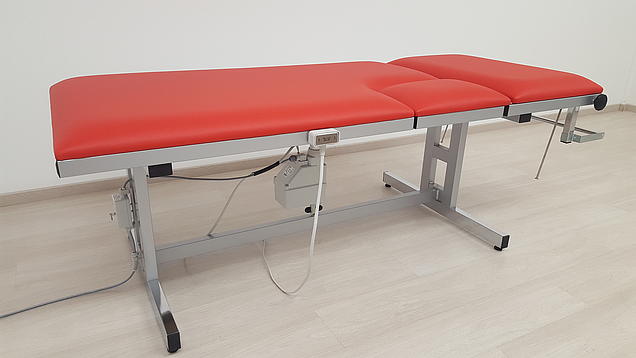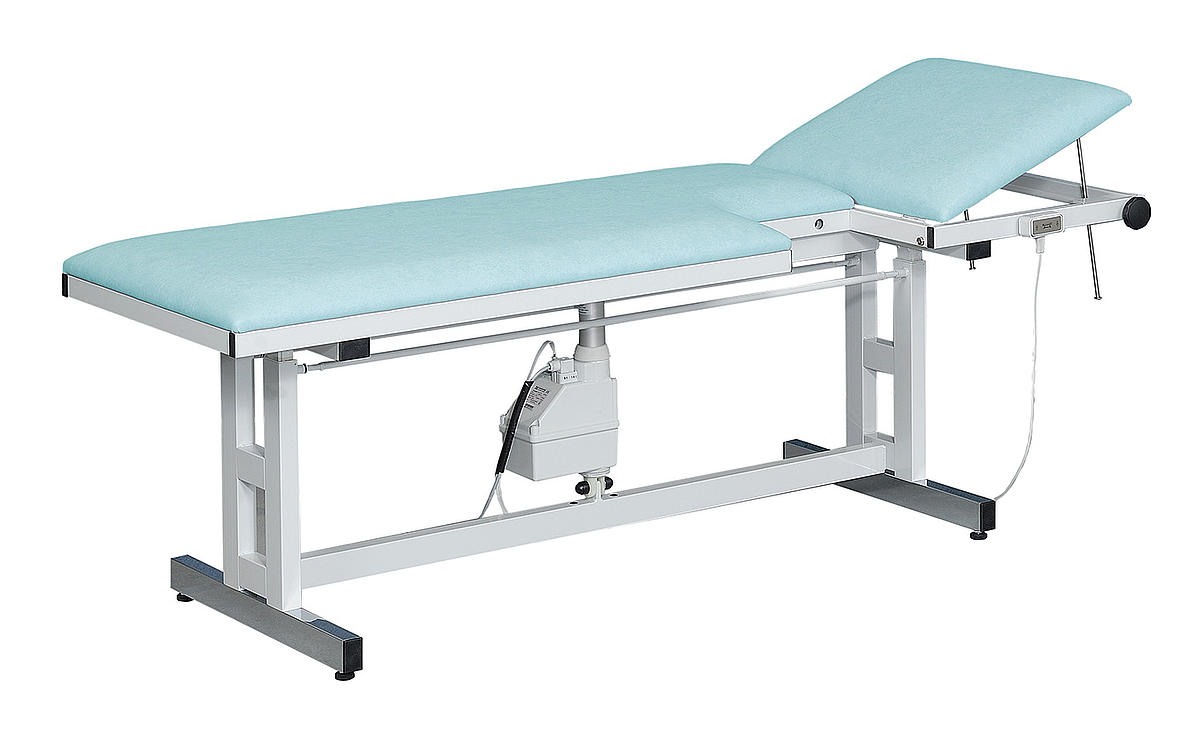 - Upotrijebljeni električni motor s glatkim radom ne zahtijeva održavanje i otporan je na prskanje. Upravlja se ručnim prekidačem (alternativno – bez nadoplate – nožnim prekidačem). Podešavanje visine (650 – 850 mm) može se naravno koristiti i kod težih pacijenata (do 200 kg). Sustav prilagodbe opremljen je blokadom gumba. Priključne vrijednosti motora: 230V, 50/60 Hz, 3.7A, 850W, IPX4, v=11mm/s, 10.000N.