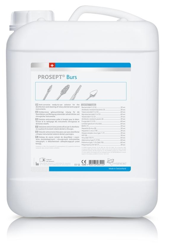 PROSEPT® burs je dezinfekcijska otopina spremna za upotrebu za rotacijske precizne stomatološke i kirurške instrumente poput dijamantnih svrdla, karbidnih svrdla, polira i instrumenata izrađenih od nehrđajućeg čelika, volframovog karbida, dijamantnog zrna, keramike, polimera i silikona. Formulacija bez fenola i aldehida sadrži inhibitore korozije koji značajno produžuju vijek trajanja instrumenata.
