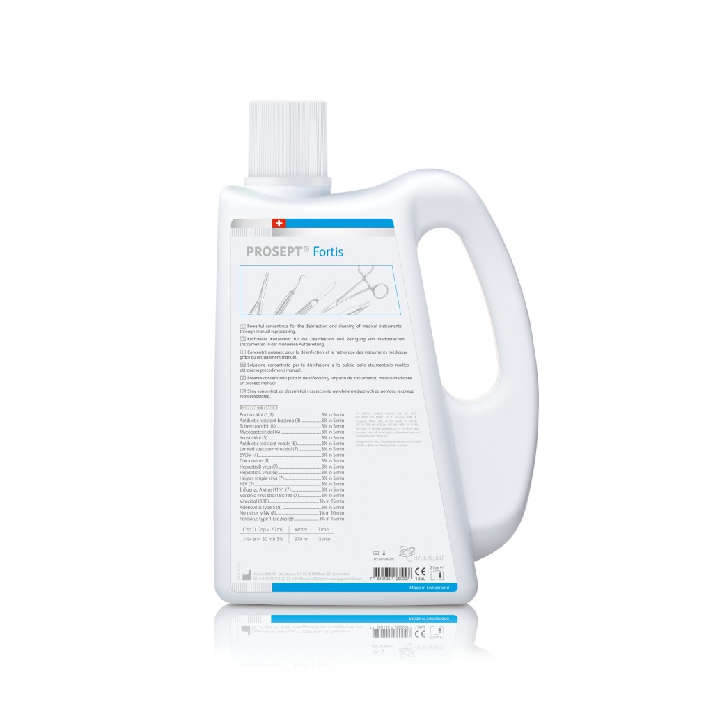 PROSEPT® Fortis je snažan koncentrat za ručnu dezinfekciju i čišćenje medicinskih i stomatoloških instrumenata izrađenih od nehrđajućeg čelika, volframovog karbida, dijamantnog zrna, titana, silicijevog karbida i silikona. Također je pogodan za rotacijske instrumente osjetljive na alkohol. PROSEPT® Fortis ne sadrži aldehide, fenole ni klor.