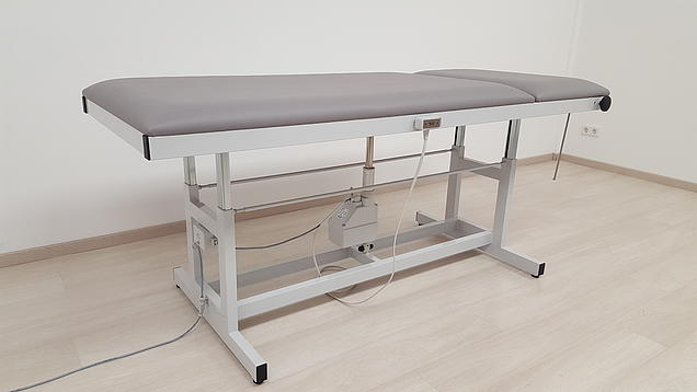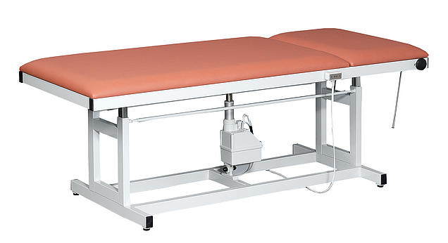 - Električni motor koji radi glatko ne zahtijeva održavanje i otporan je na prskanje. Upravlja se pomoću ručnog prekidača (alternativno – bez nadoplate – pomoću nožnog prekidača). Podešavanje visine (650 – 850 mm) može se naravno izvesti i kod težih pacijenata (do 300 kg). Sustav za podešavanje opremljen je ključnom bravom. Priključne vrijednosti motora: 230V, 50/60 Hz., 3.7A, 850W, IPX4, v=11mm/s, 10.000N.